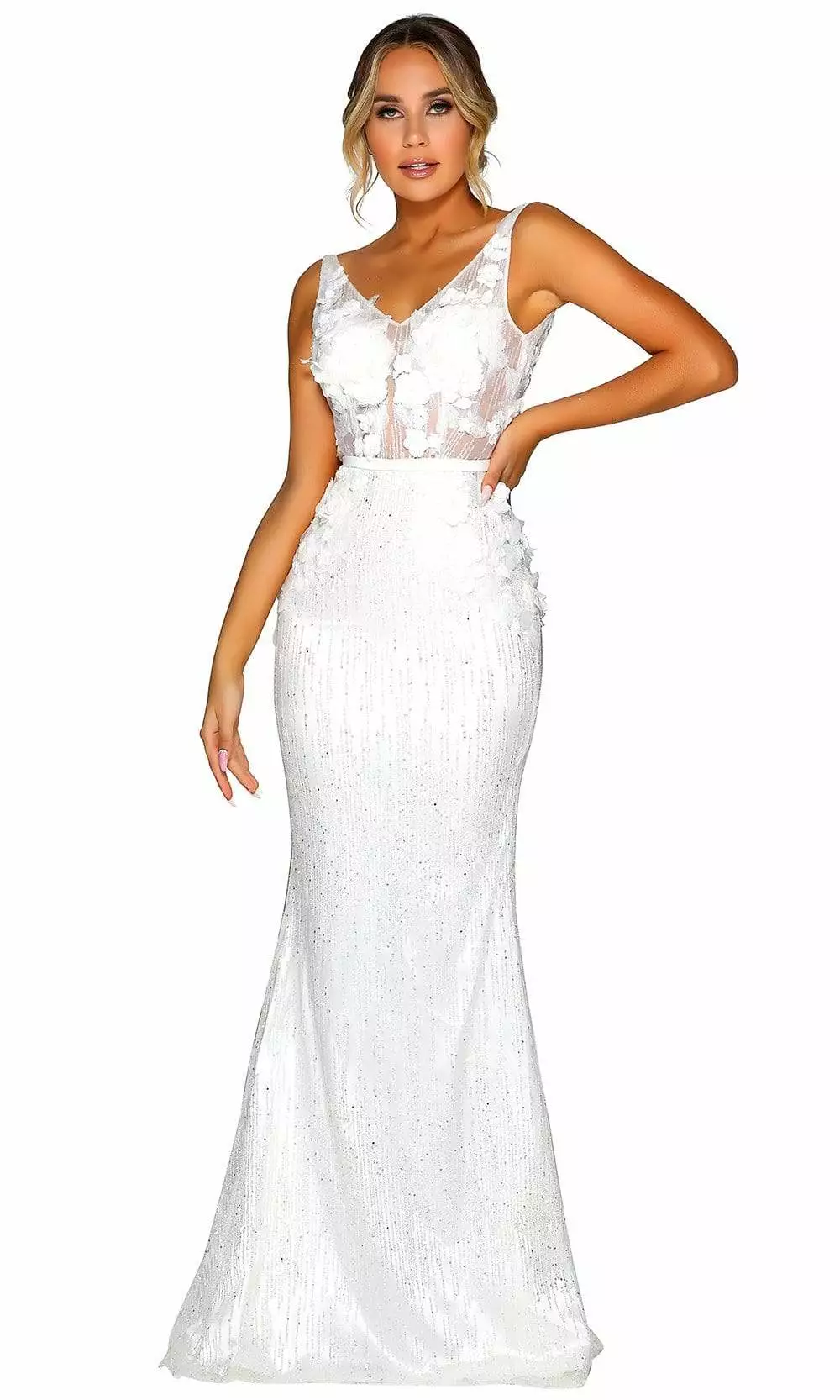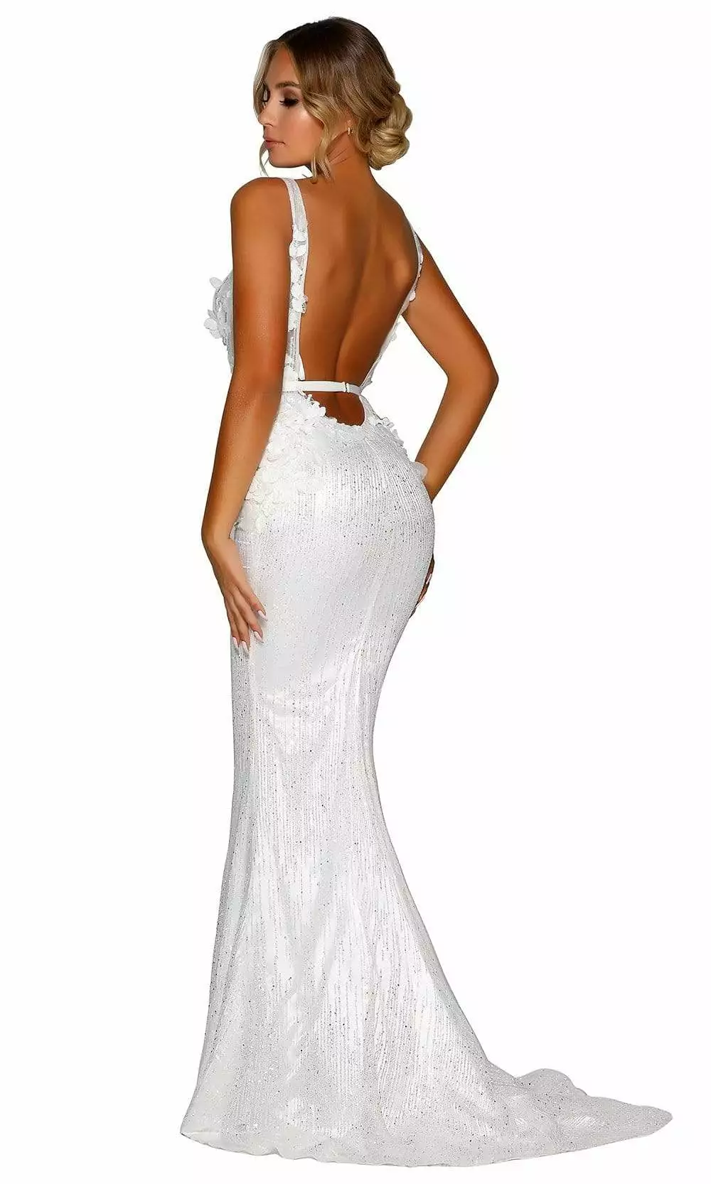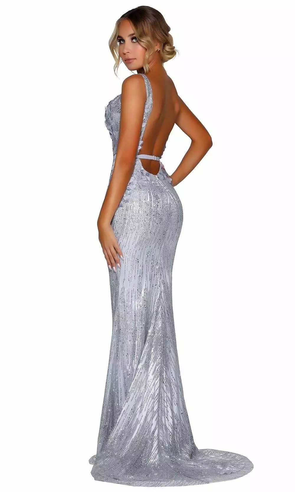 Charmingly captivate the crowd as you show up in this dazzling Portia and Scarlett PS1905 evening dress. Fabulous in full-length glitter mesh fabric while flaunting a form flattering silhouette, this stunning gown features a semi-sheer sleeveless bodice with V neckline while the back displays a low-cut bare style. The dress features fluttering 3d floral accents adorning the illusion bodice and the side of the hips, while a slender band is featured around the natural waist. The sheath skirt gently flares with a beautiful sweep train finish. Be dressed up gorgeously in this Portia and Scarlett creation.