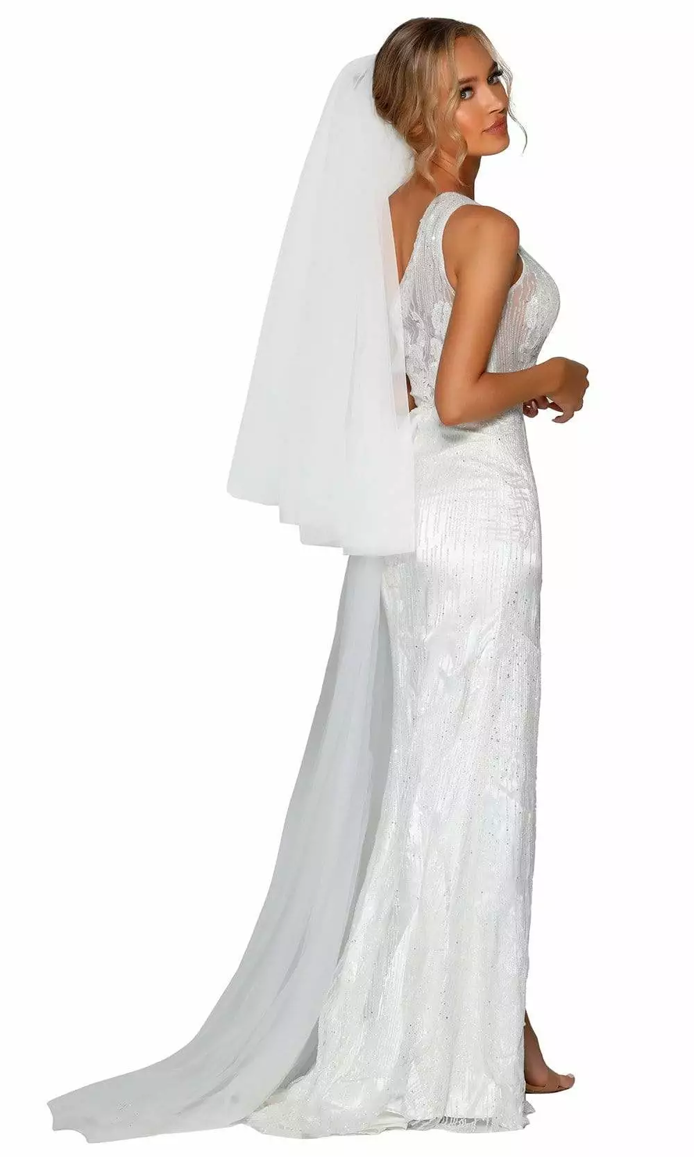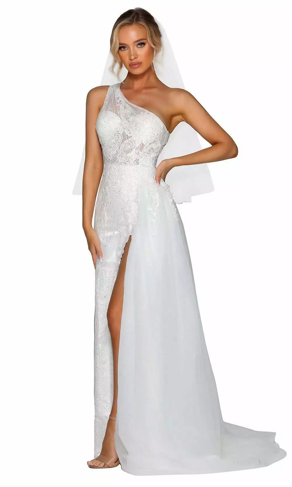 Portia and Scarlett PSB6802 wedding dress perfect for the bride who wants a romantic, ethereal look for her wedding day. This long dress features asymmetric neckline on a lace fitted bodice that showcases a fashionable bride. It parades a thigh-high slit on an A-line silhouette and dress also comes with sweep train. Portia and Scarlett making it well-suited for both petite and curvy brides who want a chic, classic look.
