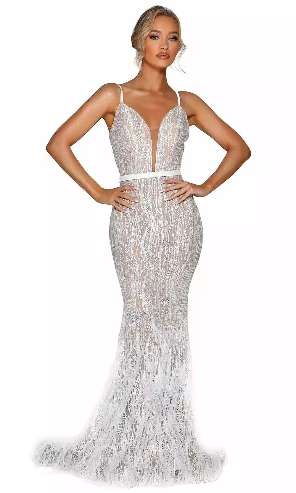 | Details: | Spaghetti strap, Plunging neckline, Sheer inset, Fitted bodice, Embroidery, Thin band, Feathers, Open V back, Back zipper, Sweep train |