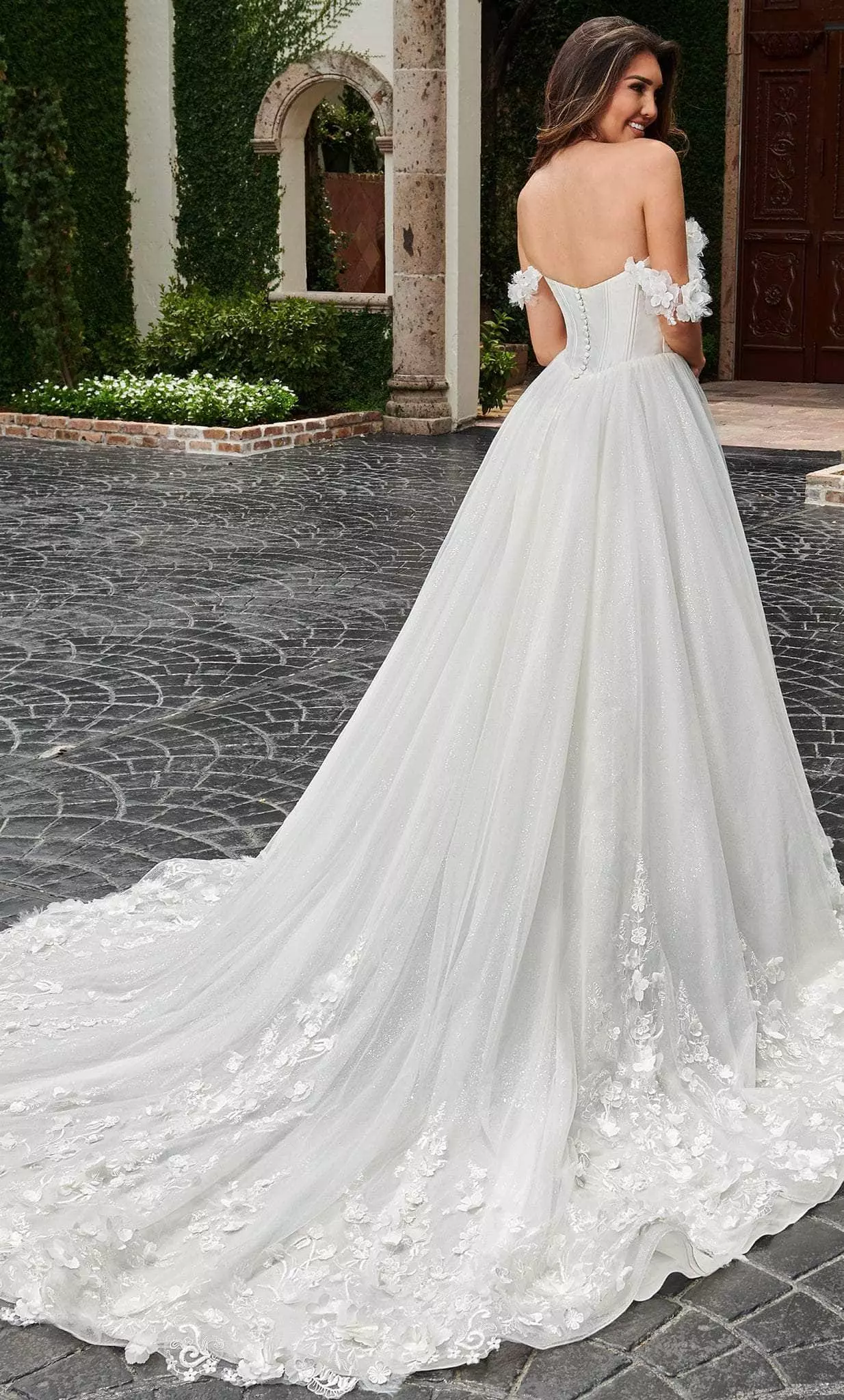 | Details: | Corset bodice, Off shoulder strap, 3D floral applique, Scoop back, Back buttons, Chapel train |