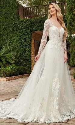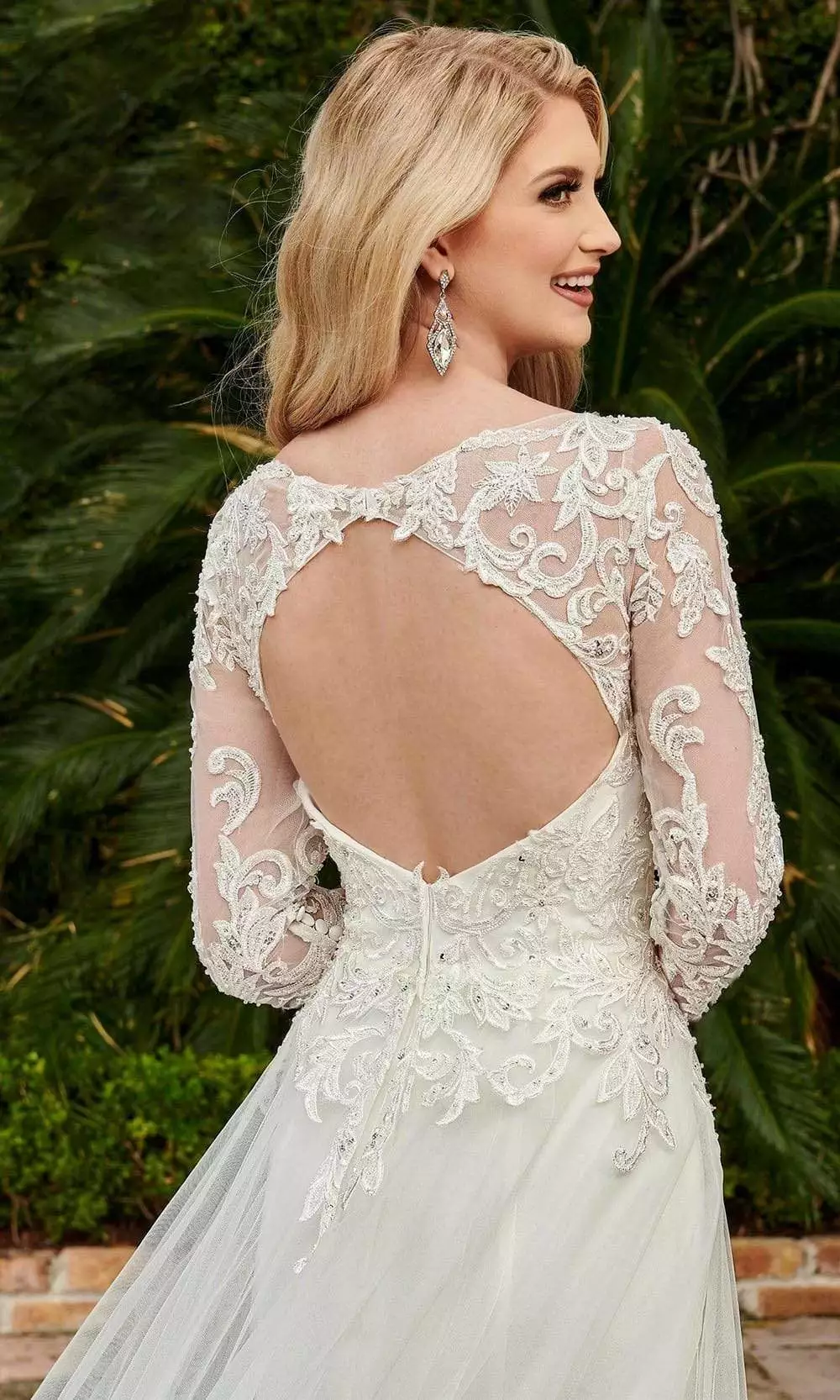Rachel Allan M786 wedding dress offers an incredibly romantic look that makes it perfect for today’s modern bride. Lavish gown features a sheer long sleeves with embroidered details on it. It is made with tulle fabric and graces V neckline on a fitted bodice then flares a wonderful A-line silhouette. Back is open to let you show some skin and then it proceed to a chapel train silhouette. This Rachel Allan is perfect for a traditional celebration or a lavish affair.
