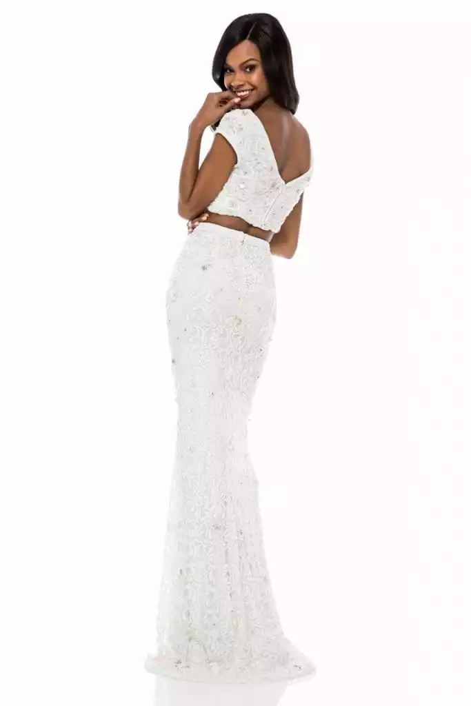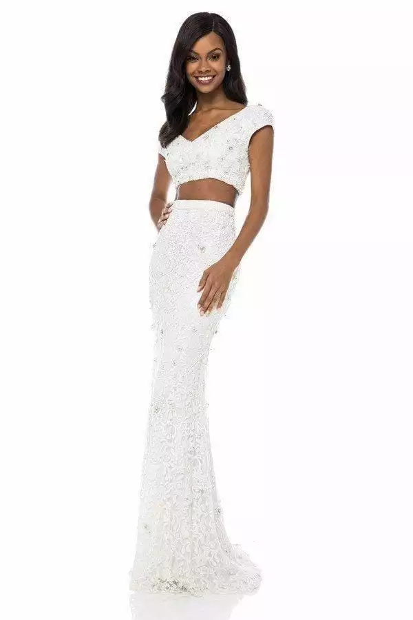 Be ready to fascinate everyone in this dress by Sherri Hill 51734. This two piece beaded dress fashions a wide V-neckline with cap sleeves. The skirt forms a fitted silhouette and runs in full length hem. Flatter your finest assets as you enthrall the crowd in this Sherri Hill look.