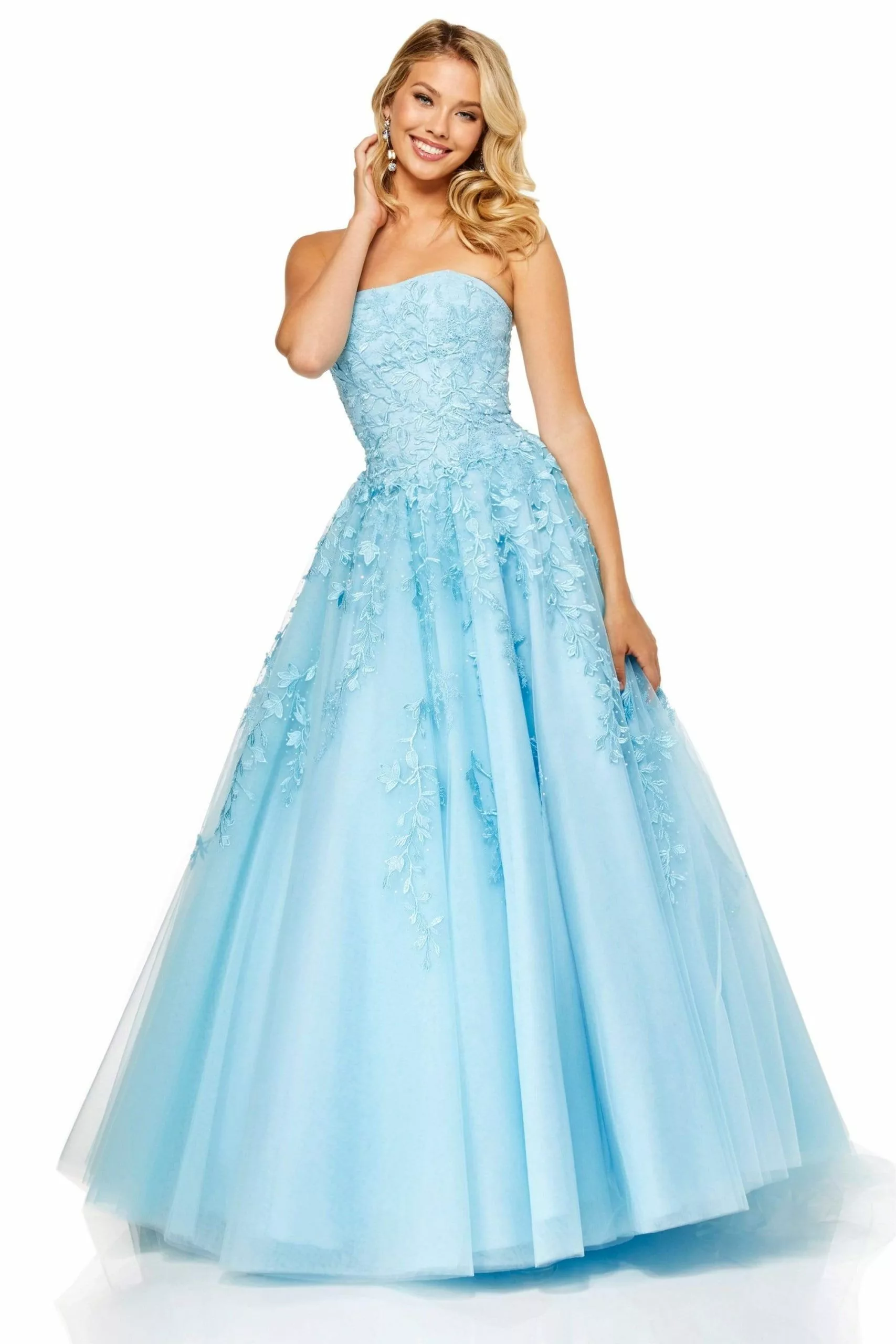 Be an emblem of utter elegance in this Sherri Hill 52341 creation. Trailing with embroidered foliage on a tulle fabric, this stunner shows a modified sweetheart neckline coupled with a mid-open back. The sheer tulle skirt layers to form into a gossamer A-line silhouette and a train. Effortlessly secure the spot of the belle of the ball in this Sherri Hill masterpiece. Models are wearing the Ivory, Light Blue and Nude colors.