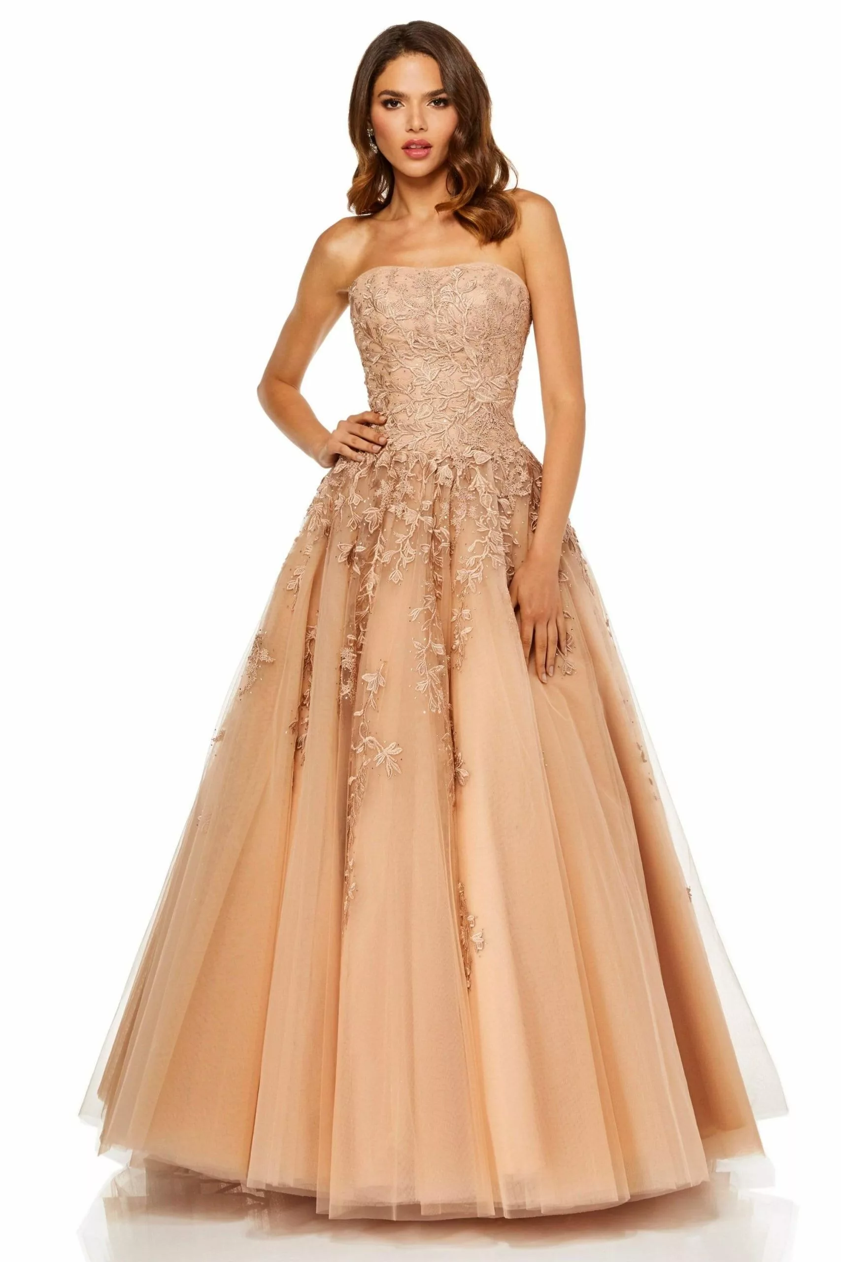 | Details: | Strapless, Embroidered Lace, Mid-Open Back, Back Zipper Closure, Tulle Skirt, Full Length Hem, Sweep Train |