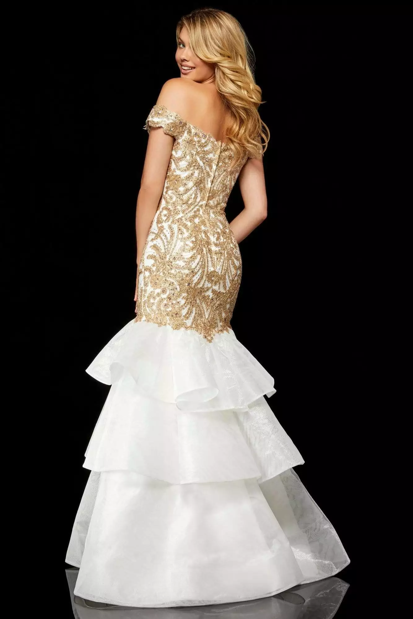 Look like a spectacular vision from every angle in this Sherri Hill 52347 creation. Festooned with metallic lace appliques, this stunner flaunts an off shoulder neckline with a sweetheart notch. Showing cap sleeves and a mid-open back, the mermaid skirt flares in lush tiers as it completes at a full length hemline. Charm everyone with this inspired Sherri Hill masterpiece. Models are wearing the Ivory Gold and Light Blue colors.