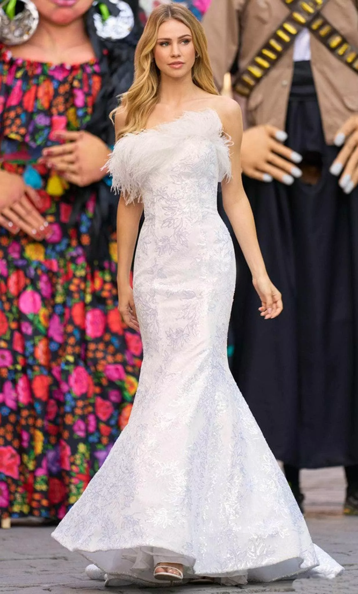 Make a statement on your wedding day by wearing this opulent Sherri Hill 55327 dress. This exquisite gown has a strapless fitted bodice crowned with an asymmetrical neckline beautifully adorned with feathers. It is glamorously embroidered and crafted with clean seams. The full-length skirt parades in a mermaid silhouette and ends with a sweep train. You are more than gorgeous when you wear this unbeatable masterpiece from Sherri Hill 55327. Model is wearing Ivory and Silver color.