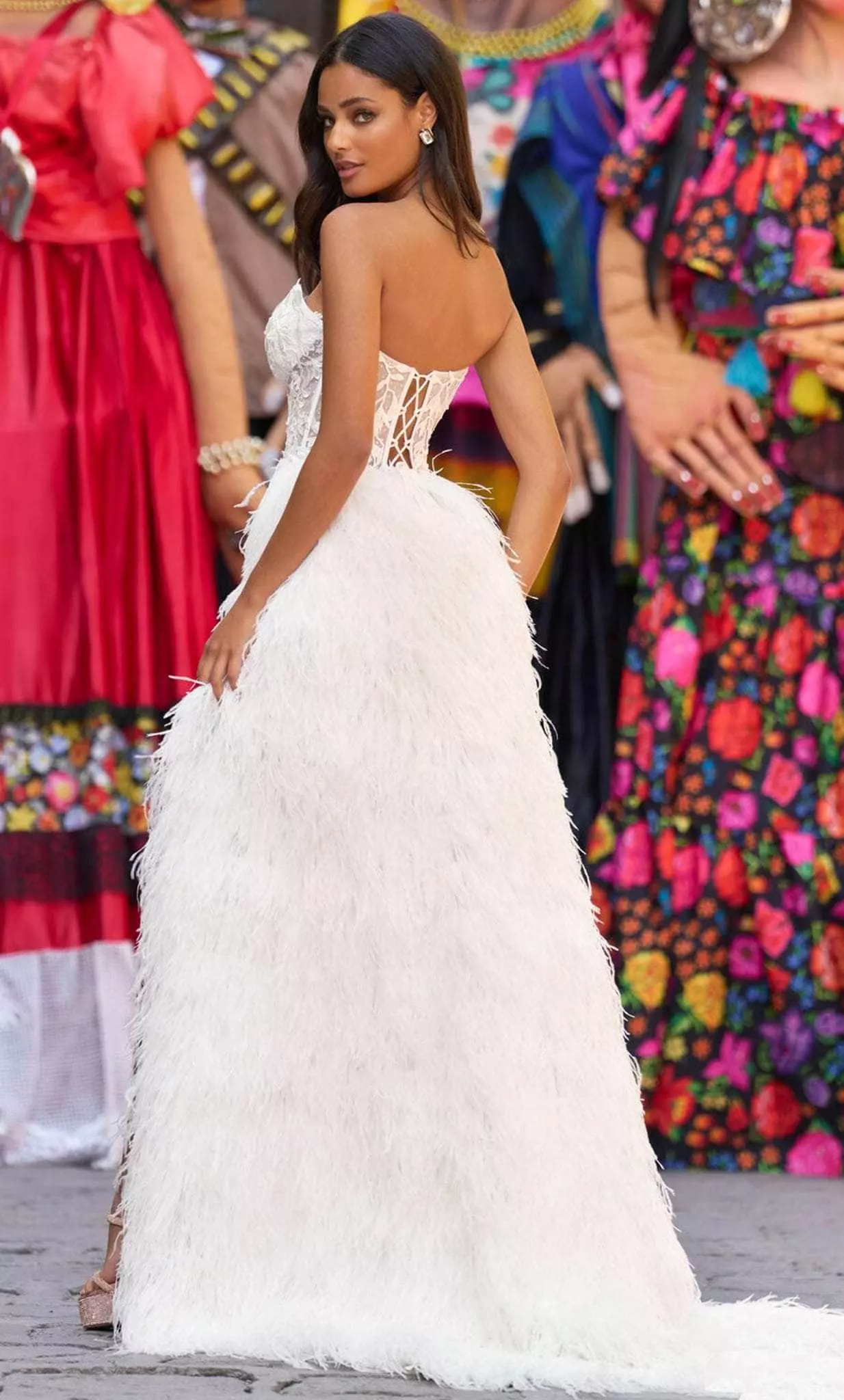 | Details: | Appliqued, Corset, Feathered, Back Zipper, High Slit, Train |