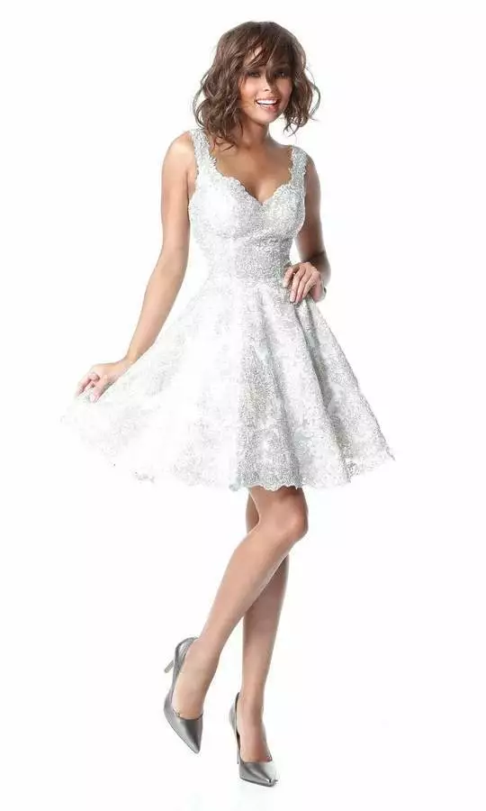 Ornamented with metallic lace and sprinkling of rhinestones, this beauty shows a sweetheart neckline framed with wide straps. Showcasing a fitted bodice and a mid-open back, the short A-line skirt flares into a queenly effect. Models are wearing the Gold and Silver colors. Find more prom dresses!