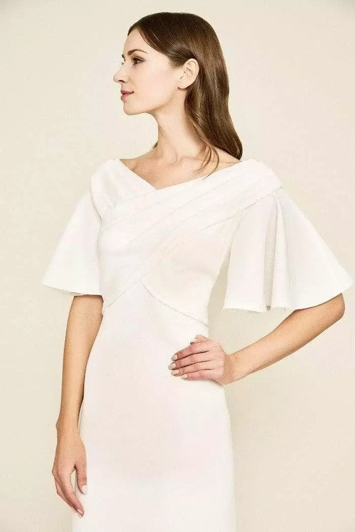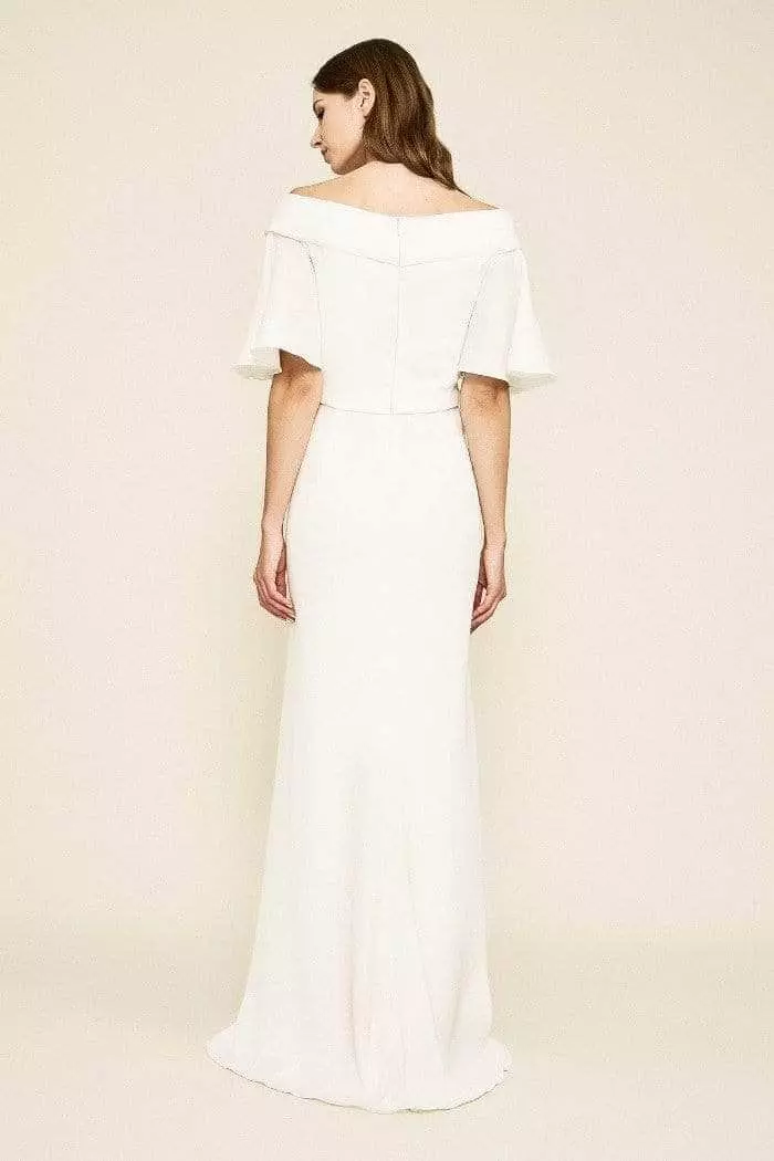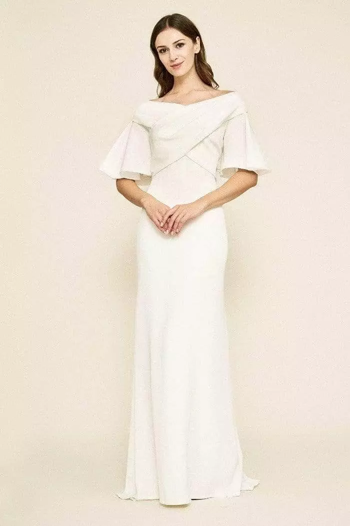 Exquisitely tailored in elegant crepe fabric, this fascinating piece features crisscross style at the bodice with off-shoulder neckline and draping bell sleeves. The skirt sculpts charmingly from the hips before it flares subtly and finishes at floor length. Model is wearing Ivory color.