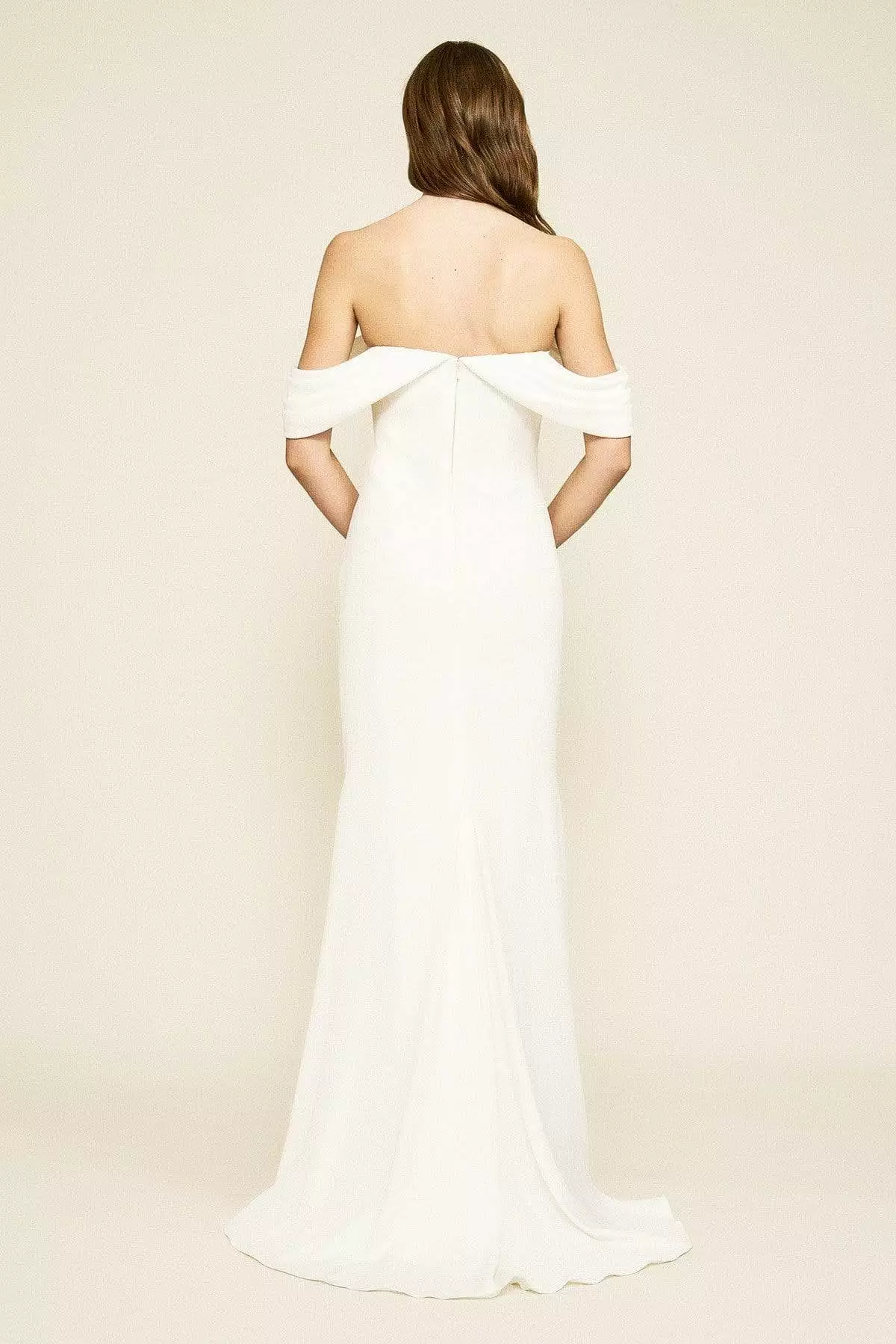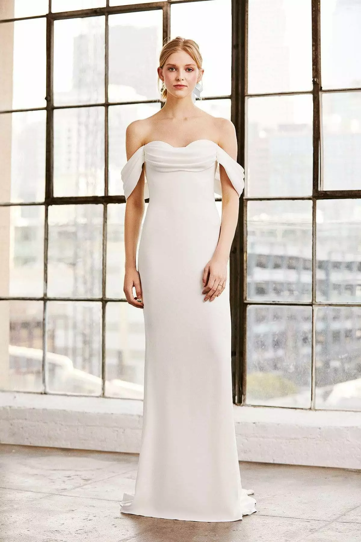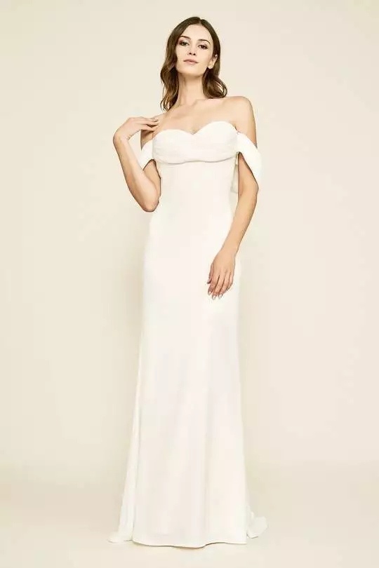 | Details: | Off-shoulder sleeves, Soft tucks, Fitted bodice, Sheath skirt, Sweep train, Crepe, Invisible zipper |