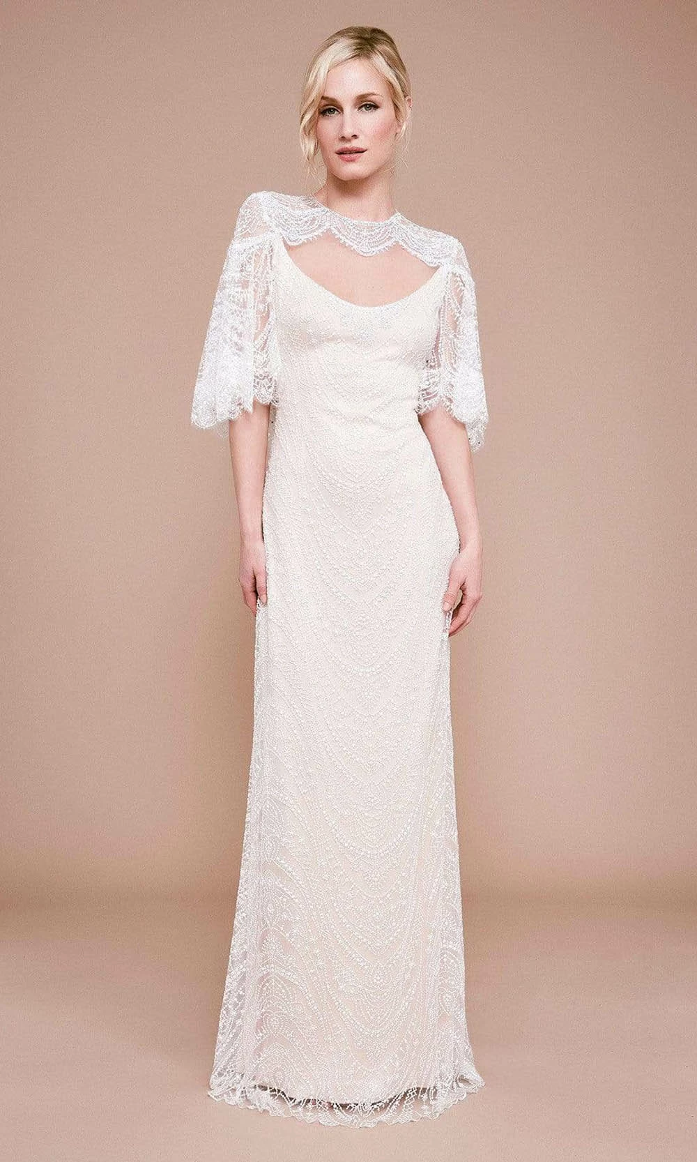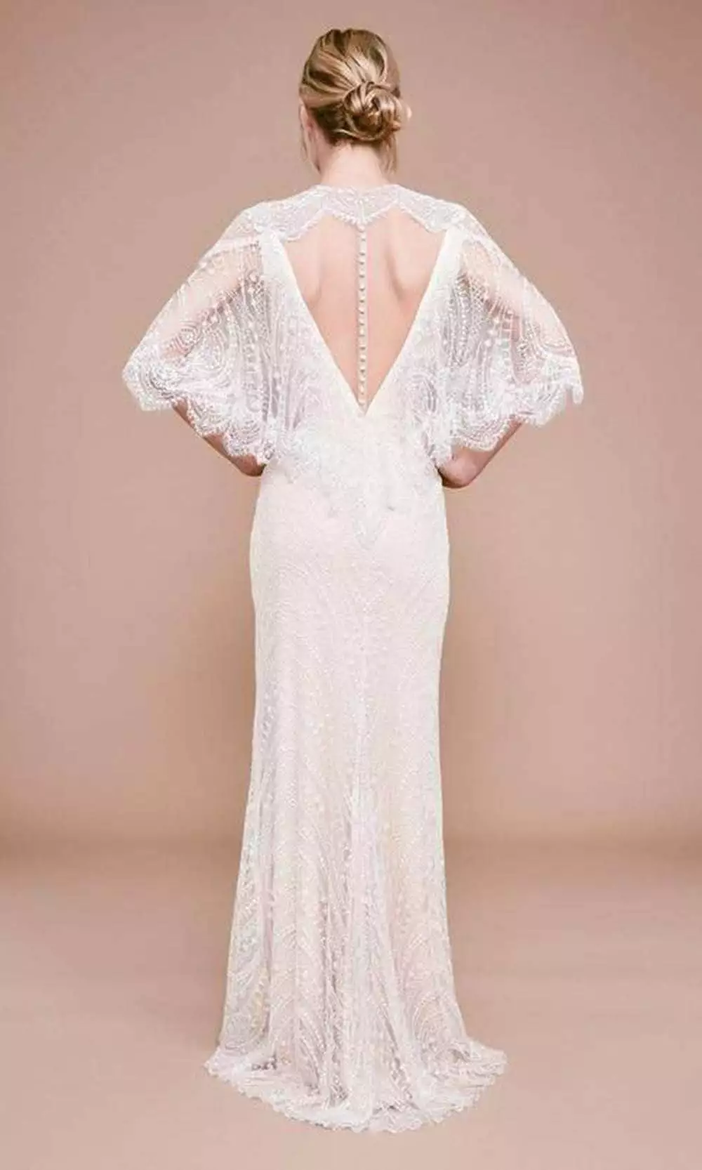 | Details: | Bell sleeves, Pearls, Fitted bodice, Sheath skirt, Embroidery, Capelet, Buttons, Invisible zipper, Sweep train |