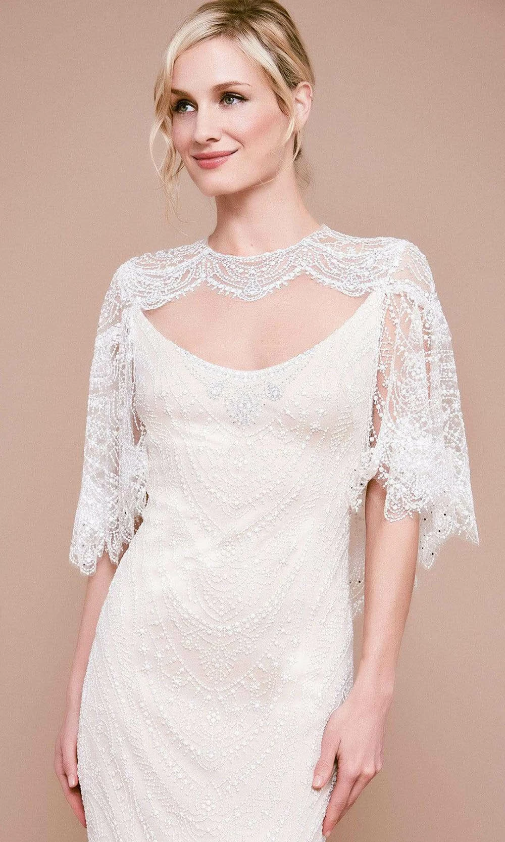 Draped pearls inspire this wedding gown’s allover embroidery. A scalloped edge on the attached capelet lends a feminine air while the crystal-embellished decorative buttons add a touch of shimmer. A tailored knit lining ensures a curve-skimming (and comfortable) fit and a side seam invisible zipper makes this gown easy to wear.