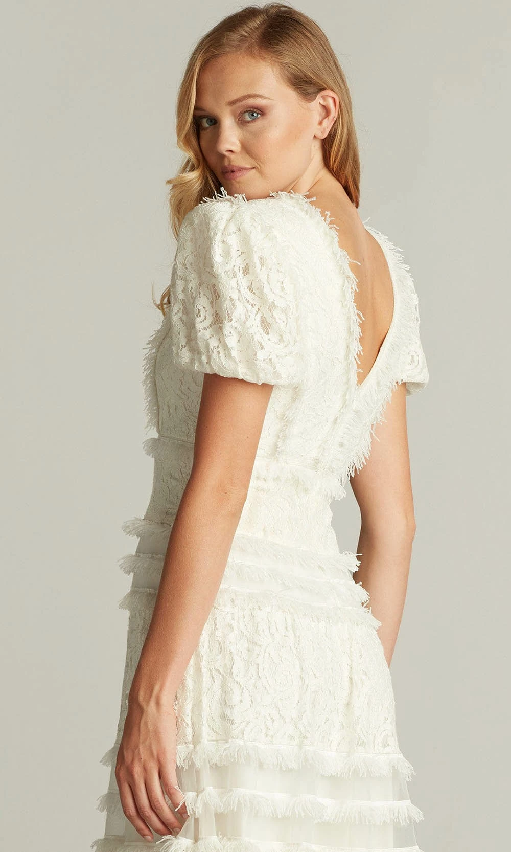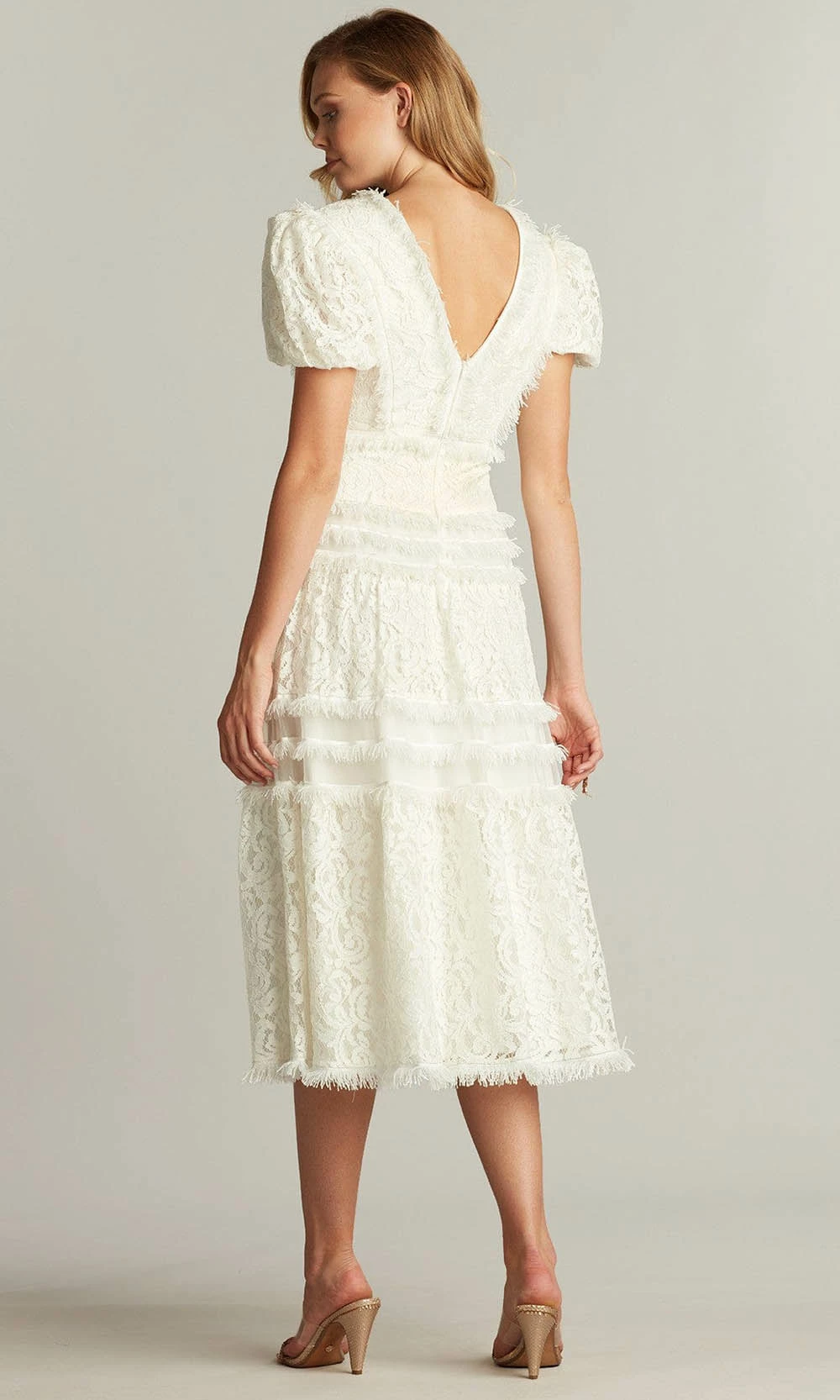 Be a breath of fresh air on your next soiree in this exquisite Tadashi Shoji BTR22113MD creation. Exquisitely accented with fringes on a lace silhouette, this dress parades a v-neckline with framing puff sleeves. Detailed with a low v-open back and a concealed zipper closure, the skirt creates an A-line silhouette with lace tiers and sheer banding as it falls into a tea length hemline. Dress to impress with this stylishly designed Tadashi Shoji masterpiece. Stand out in the crowd with in Tadashi Shoji design with dresses that are meant to make women feel gorgeous, confident, and comfortable. Model is wearing the White color.