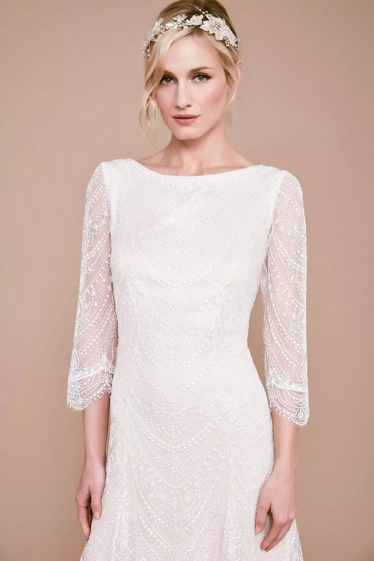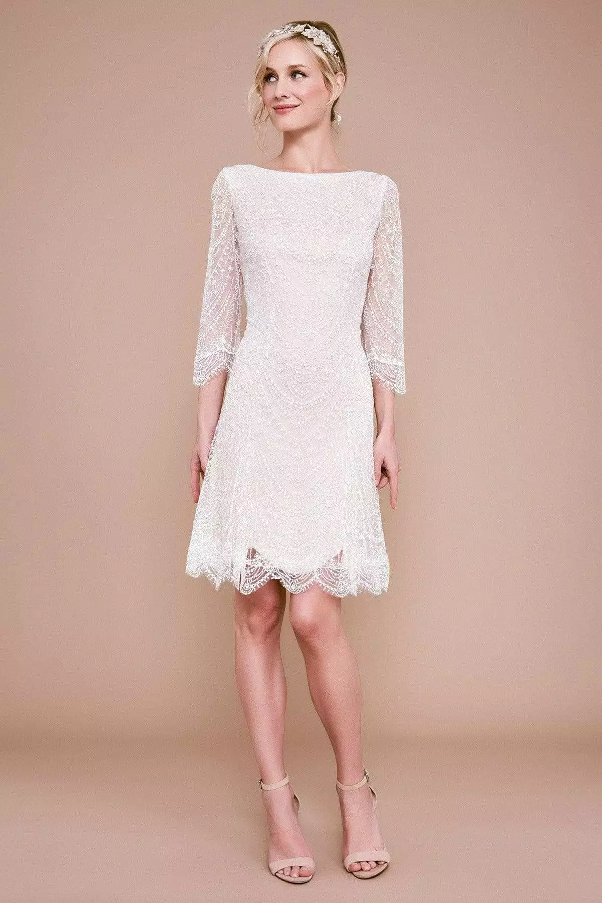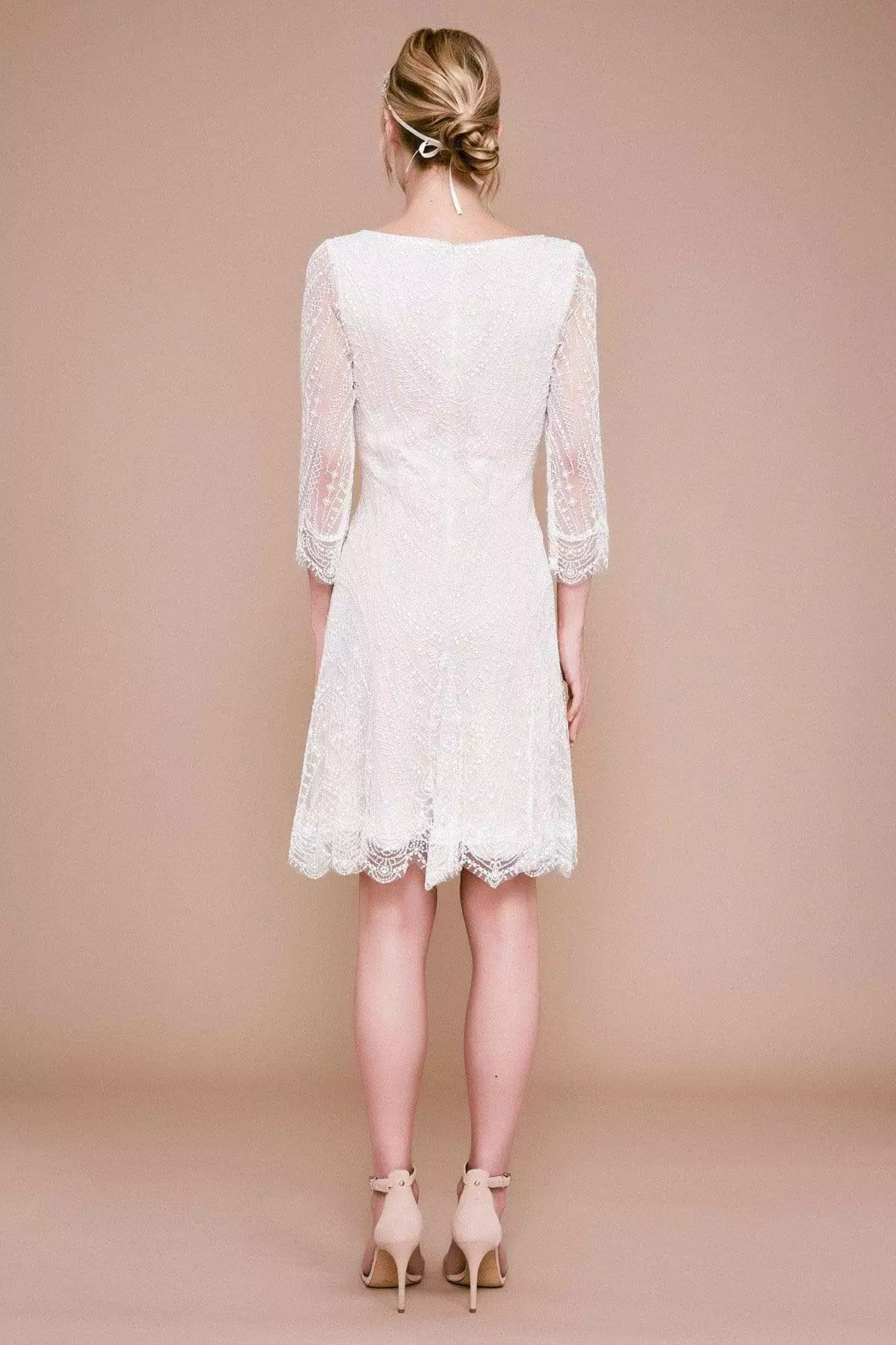 | Details: | Quarter length sleeves, Embroidery, Fitted bodice, A-line skirt, Scalloped hemline, Center back invisible zipper, Pearls |