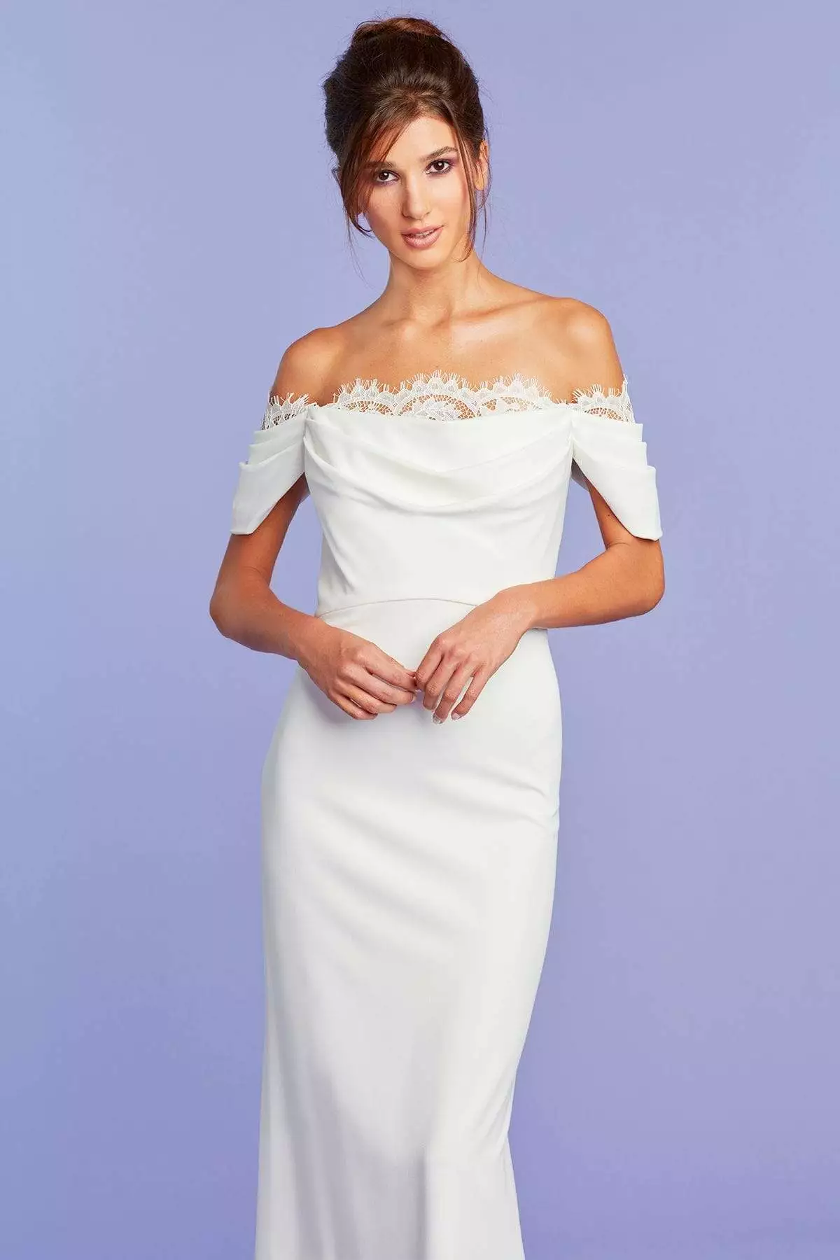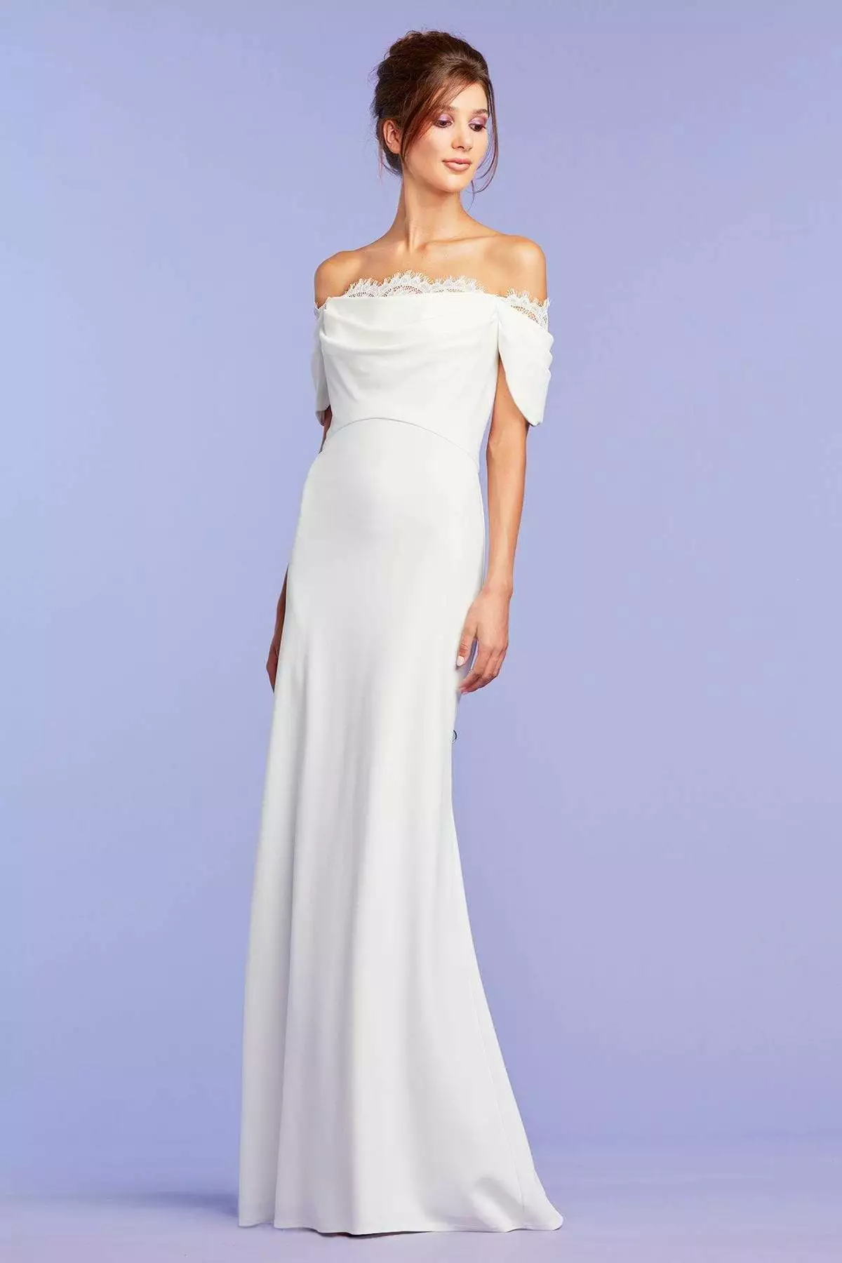Infuse your special event with stellar style in this Tadashi Shoji BOS20408LBR. Features an off shoulder neckline adorned with scalloped trim, this ethereal dress has a slim silhouette that falls down to the floor and ends with a sweep train. This Tadashi Shoji is sure to create a striking look that is sure to make anyone remember your grand entrance.