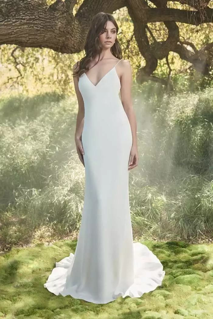 | Details: | Sleeveless, Spaghetti straps, Plunging neckline, Fitted bodice, Sheath skirt, Sweep train |