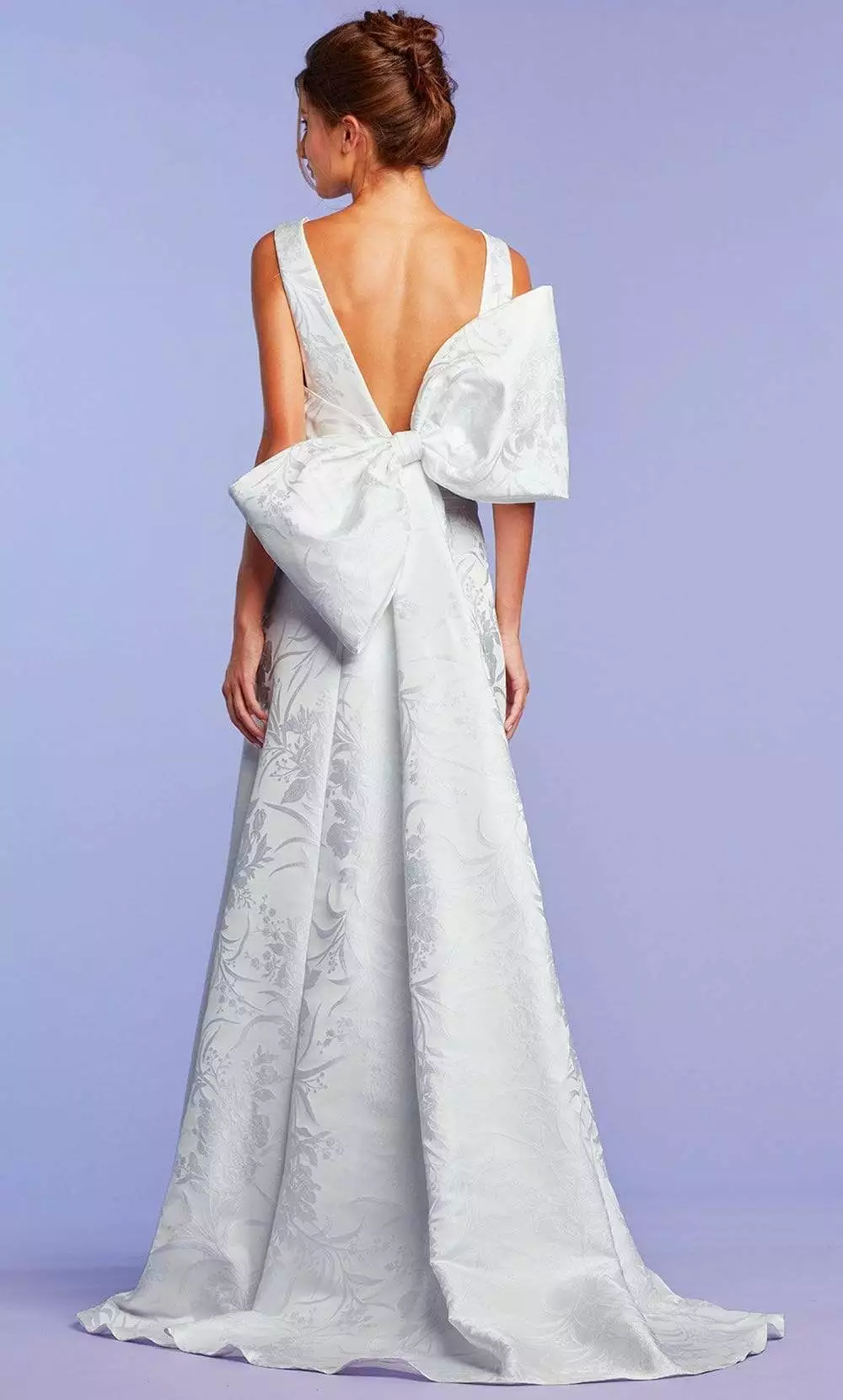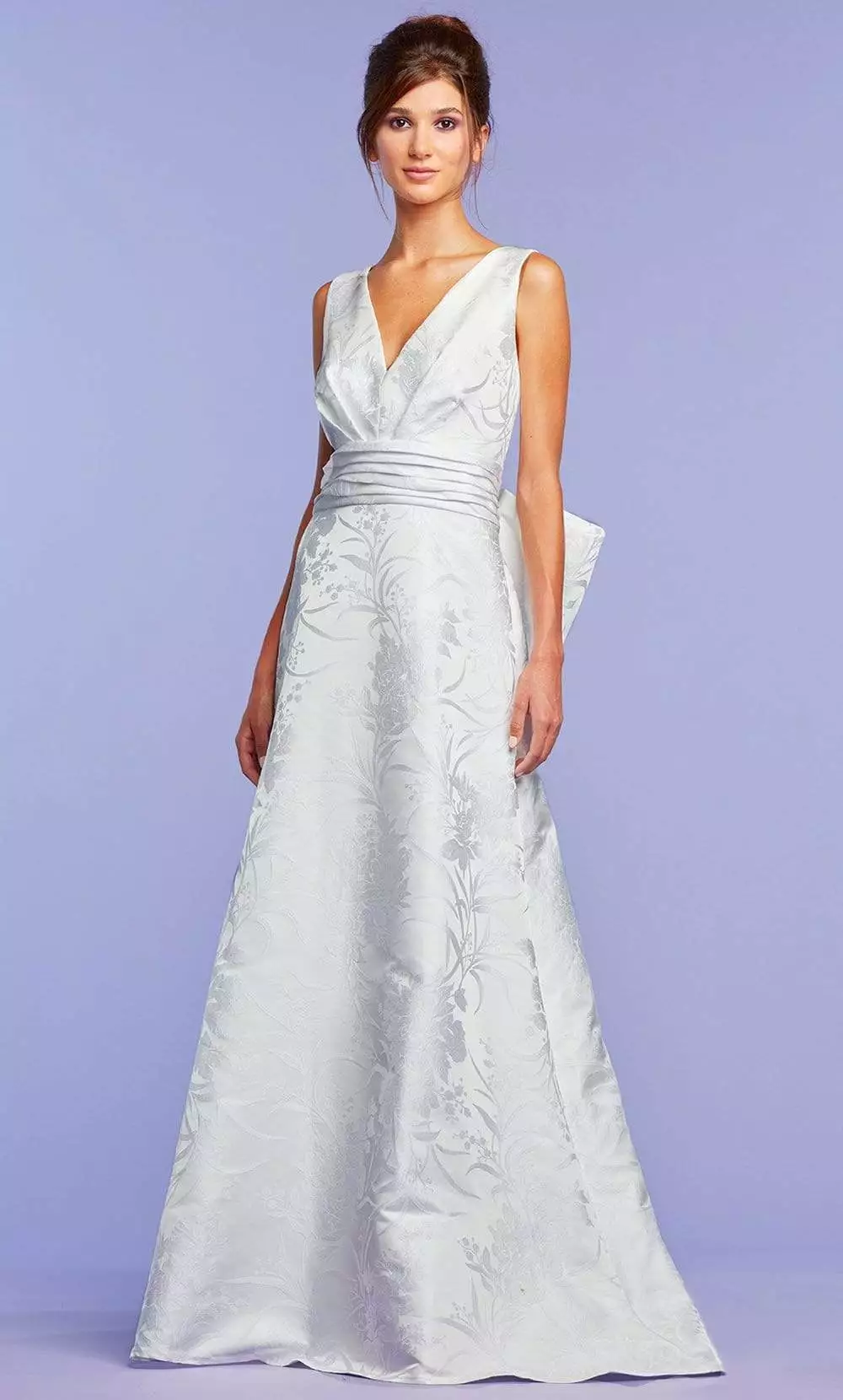Bask in the whimsical beauty of this captivating Tadashi Shoji BQO20300LBR wedding gown. Draped into a sleeveless brocade silhouette, this gown features a deep v-neckline with a low v-open back and an oversized bow. Pleats highlights the natural waist as the A-line skirt flares into a train. Dance with your true love in utter elegance in this Tadashi Shoji masterpiece.