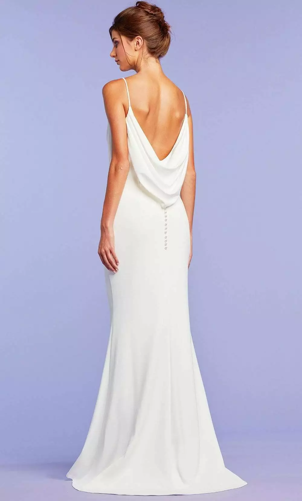 This Tadashi Shoji BOS20303LBR dress has soft draping underscores this crepe wedding gown’s graceful elegance. Delicate shoulder straps and front and back cowl necklines frame and accentuate in an ultra-flattering manner. Pearl button detailing adds a touch of embellishment on the fitted-through-the-hips skirt, which finishes in a sweep train. Leave everyone speechless when you enter the room in this Tadashi Shoji look.