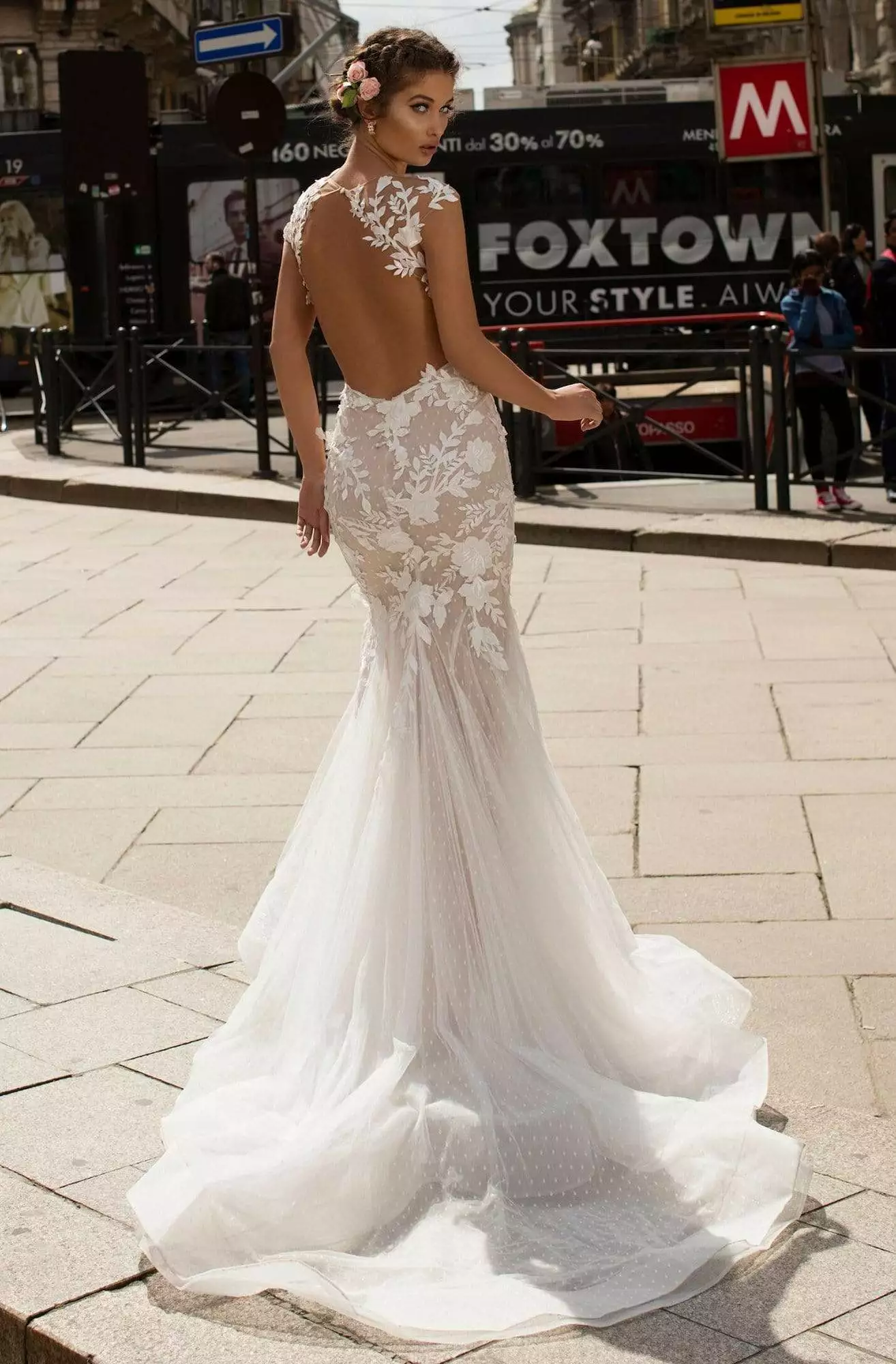 | Details: | Cap sleeves, Sheer fabric, Floral lace, Fitted bodice, Mermaid skirt, Open back, Sweep train |