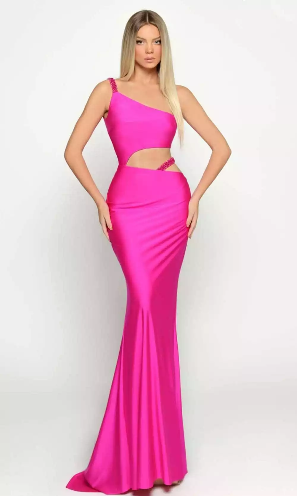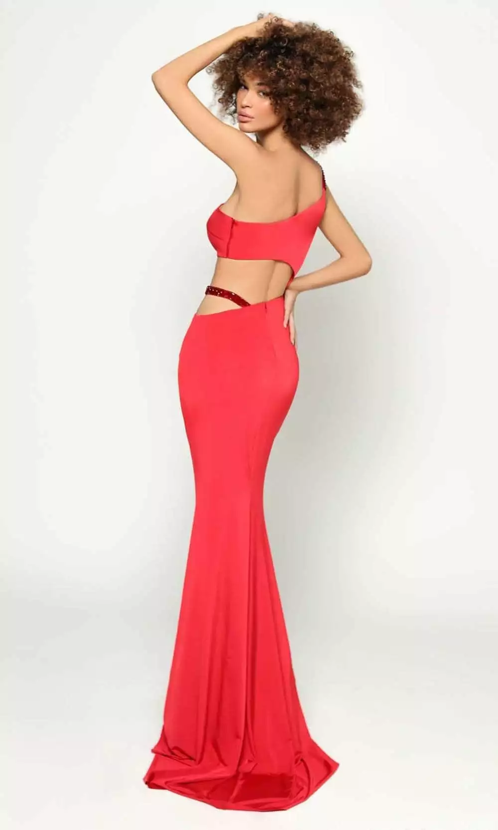| Details: | Fitted, Sleeveless, One-Shoulder Thick Strap, Cut-Out, Full Length, Mid-Open Back, Back Zipper |