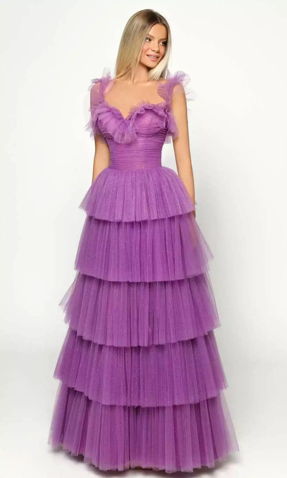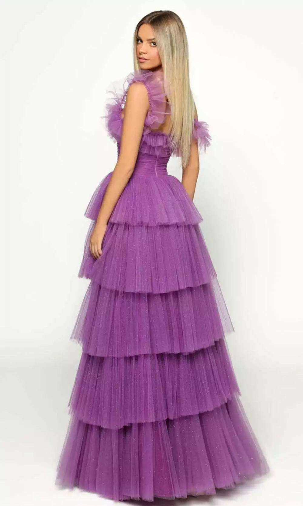 Make your night one to remember with this Tarik Ediz 51038 evening dress. Revealing a fitted and sleeveless bodice, this dress shows a ruffled sweetheart neckline supported by ruffled straps. This also shows an A-line silhouette tiered skirt down to its full length while the back shows a mid-open back with back zipper closure to complete the look. Exhibit exceptional style in this superb evening dress by Tarik Ediz. Model is wearing Purple color.