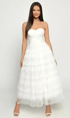 Look simple yet glamorous with this Tarik Ediz 51146 evening dress. This long dress fashions a strapless neckline in a sleeveless bodice with corset. This also displays an A-Line silhouette in a layered skirt down to its full length. Show off your classy style when you wear this Tarik Ediz creation. Model is wearing Ivory color.