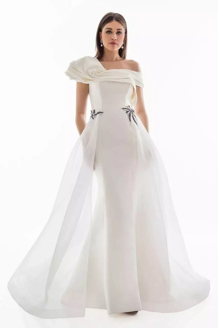 Resonate a sophisticated style that would rival that of the stunning celebrities in this Terani Couture 1821E7100 creation. Sleekly gathered into a dramatic panel to create a theatrical off shoulder neckline, this beauty showcases a slender bodice trimmed with sculpting seams and a complementary asymmetrical v-cut back. Beautifully embellished with a marriage of pearls and beads framing the sheer pleated overskirt, the mermaid skirt boasts of a showcase of the legs with its high slit and a stunning froth of sweep skirt. Have the crowd long for your alluring presence in this Terani Couture masterpiece.