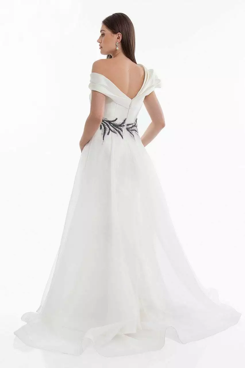| Details: | Gathered Asymmetrical Panel, Short Sleeves, Seams, Organza Overskirt, Pearl and Bead Accented Waist, Asymmetrical V-Cut Back, Back Zipper Closure, High Side Slit, Sweep Train |