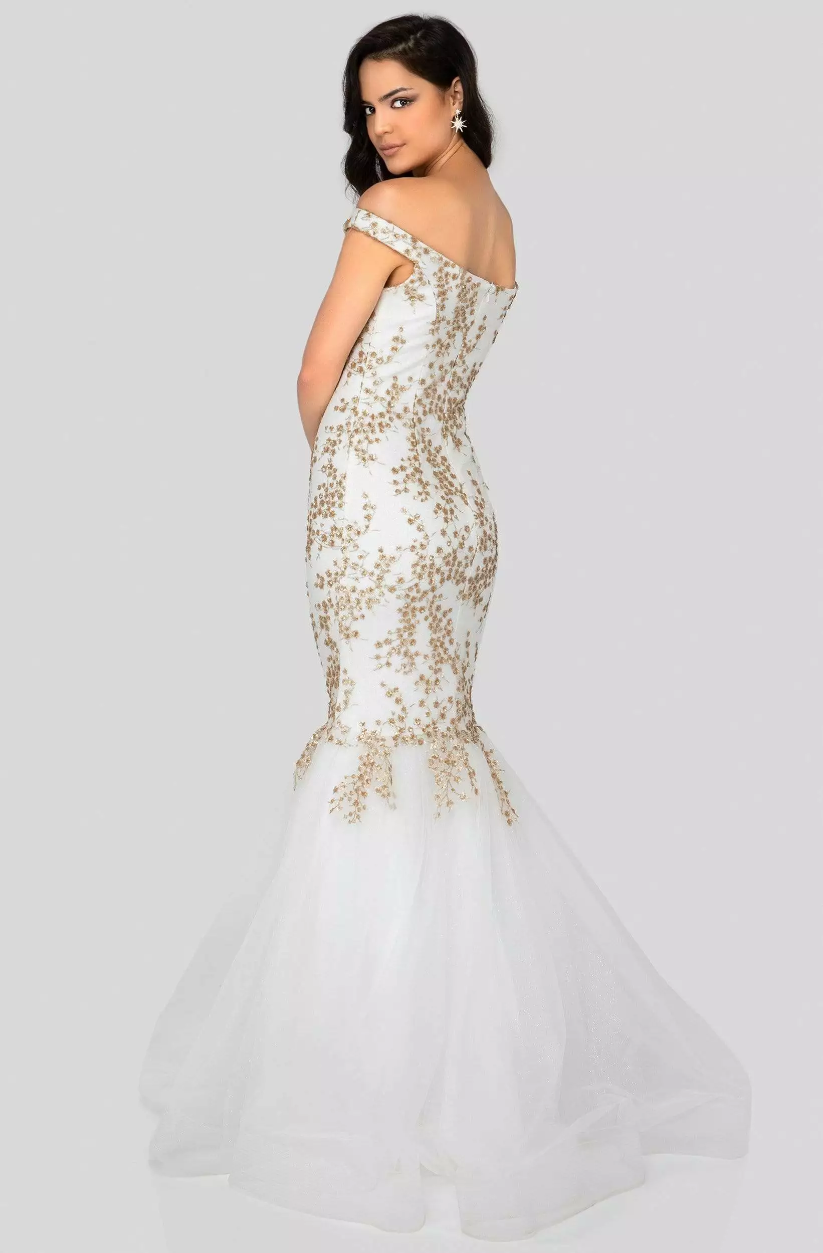Wrap up in this winning style for evening by Terani Couture 1911P8646. An off shoulder neckline with sheer inset detail at the bust frames the fitted bodice complemented with a mid-open back. Golden 3D vine embellishments scattered allover the top cascading down the drop waist. The voluminous mermaid skirt flares with a floor-length fancy fishtail hemline. Turn heads instantly when you wear this Terani Couture ensemble. Model is wearing Ivory Gold color.