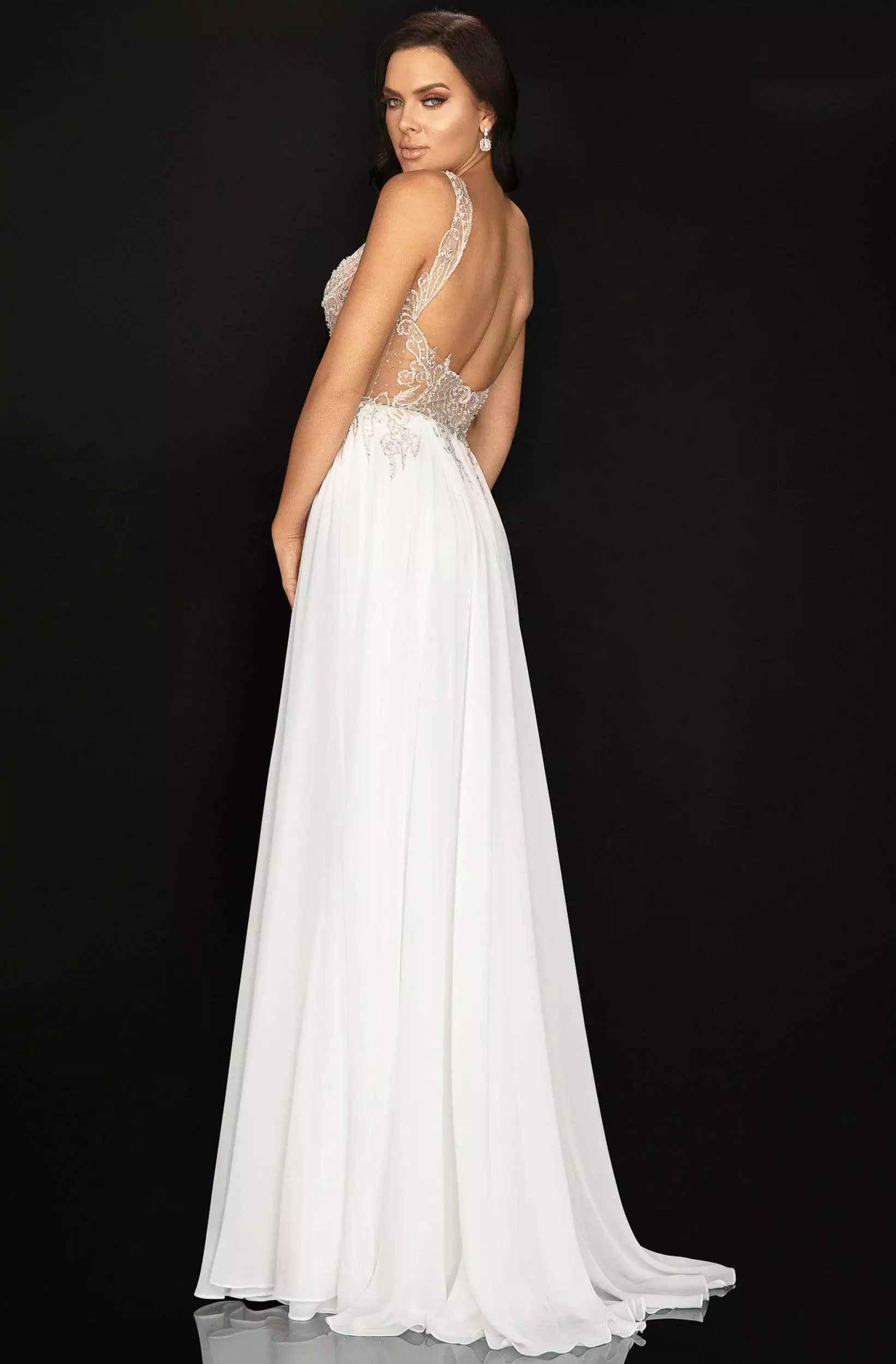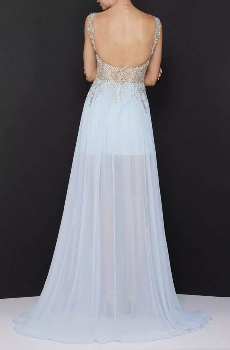 Glisten as the starry midnight sky in this alluring Terani Couture 2011P1056 creation. Festooned with a sprinkling of tiny jewels on metallic appliques, this stunner shows a deep v-neckline on a nude bodice. Flourishing a deep scoop open back, ornaments run from the waist as the sheer A-line skirt parts with double high slits as it falls into a sweep of train. Lavish in the regal elegance of this fascinating Terani Couture masterpiece. Models are wearing the Ivory and Light Blue colors.