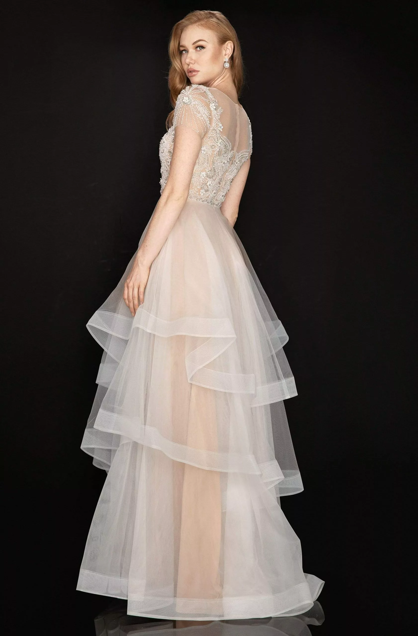 Light up the night in this eye-catching piece by Terani Couture 2011P1175. Striking bead embellishments beautify the fitted bodice, framed with an illusion bateau neckline and sheer short sleeves, complemented with a sheer full zipped up back. Fabulous pleats cascade the tiered a-line skirt as it finishes to full length with horsehair hemline. Be adorably gorgeous with this Terani Couture ensemble. Model is wearing Ivory Nude color.