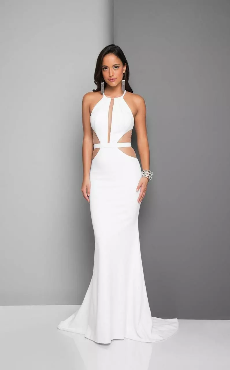 Be strikingly gorgeous in Terani Prom 1712E3297. The halter style comes alive in a sleeveless form to bare a lengthy illusion keyhole cutout about your bust. The bodice cuts away on the sides to reveal your glowing skin. A mermaid skirt flares at your legs to a full-length hem with a sweeping train. This Terani Couture dress is sure to make you the darling of the party!