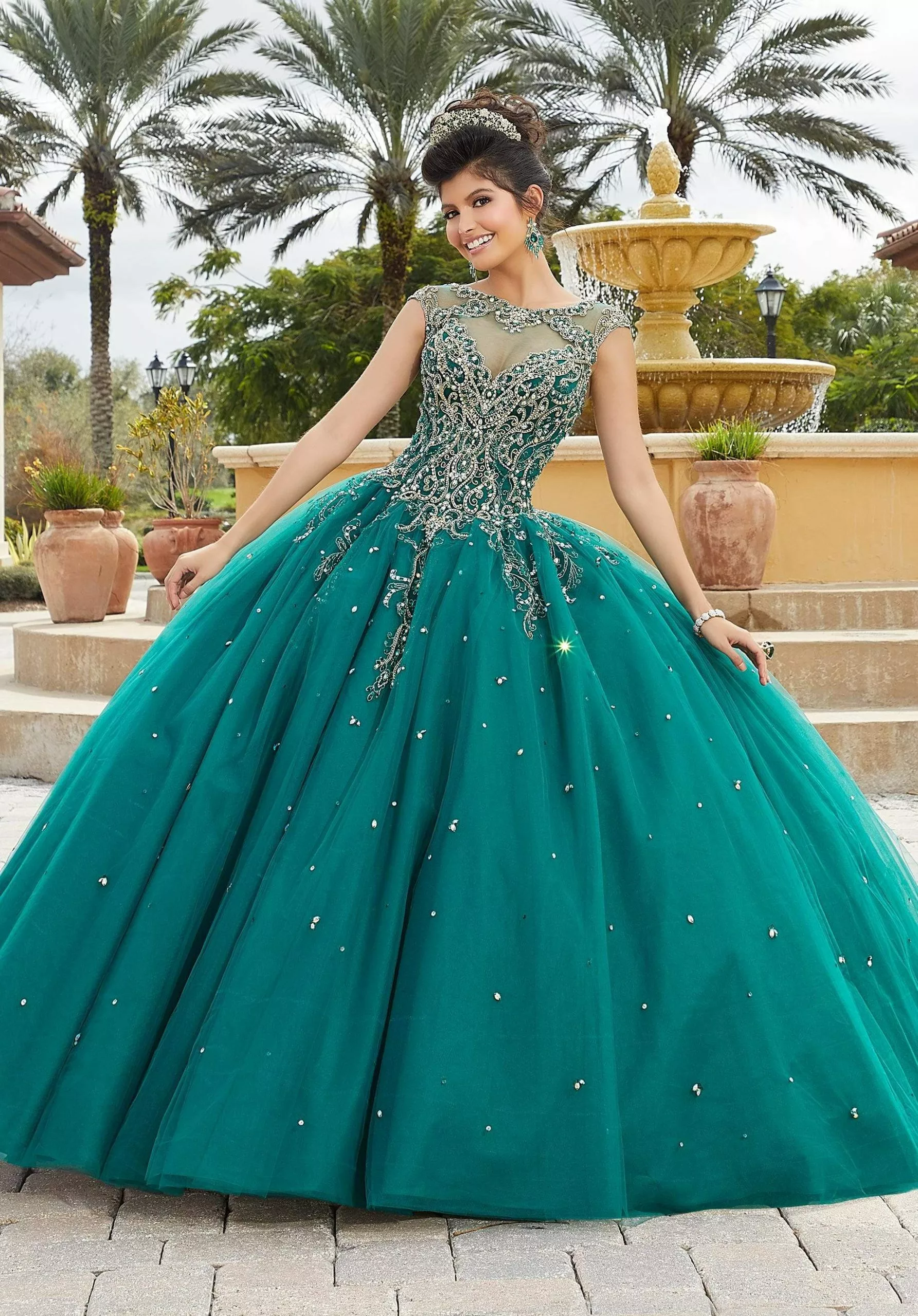 Captivate as you make your entrance in this shimmering gown from Vizcaya by Mori Lee 60094. This elegant piece showcases a lavish ensemble of crystal and rhinestone beads with metallic embroidery appliques that embellish that fitted bodice corset style bodice. Features an illusion bateau neckline with sheer yoke and shoulders. The back shows a cutout and lace-up closure. The waist is styled in Basque with trailing embroidered jewel embellishment leading to the grandiose tulle ballgown skirt. Be in this gorgeous creation from Vizcaya by Mori Lee and leave a lasting impression!