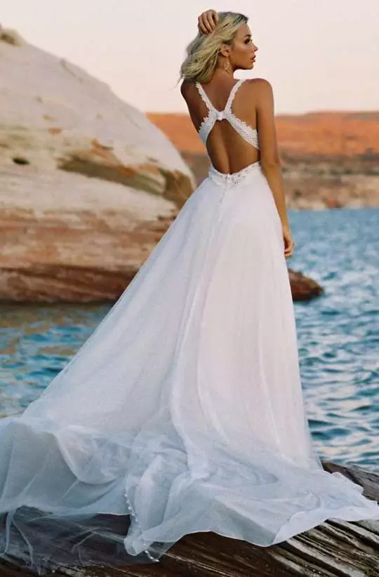 | Details: | Sleeveless, Fitted bodice, A-line skirt, Open back, Covered buttons, Sweep train |